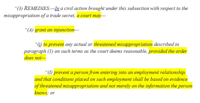 The DTSA as originally proposed as well as current laws allow the court to block threatened misappropriation of trade secrets. (“Current laws” consist of the Economic Espionage Act (“EEA”) and various state versions of the Uniform Trade Secret Act (“UTSA”) – see Mr. Pooley et al for the criticism of this status quo, the gist of which is that they provide an uneven patchwork of legislation and no civil remedies at the federal level and thereby do not adequately address the reported loss by US companies of hundreds of billions of dollars annually as a result of trade secret theft.)
